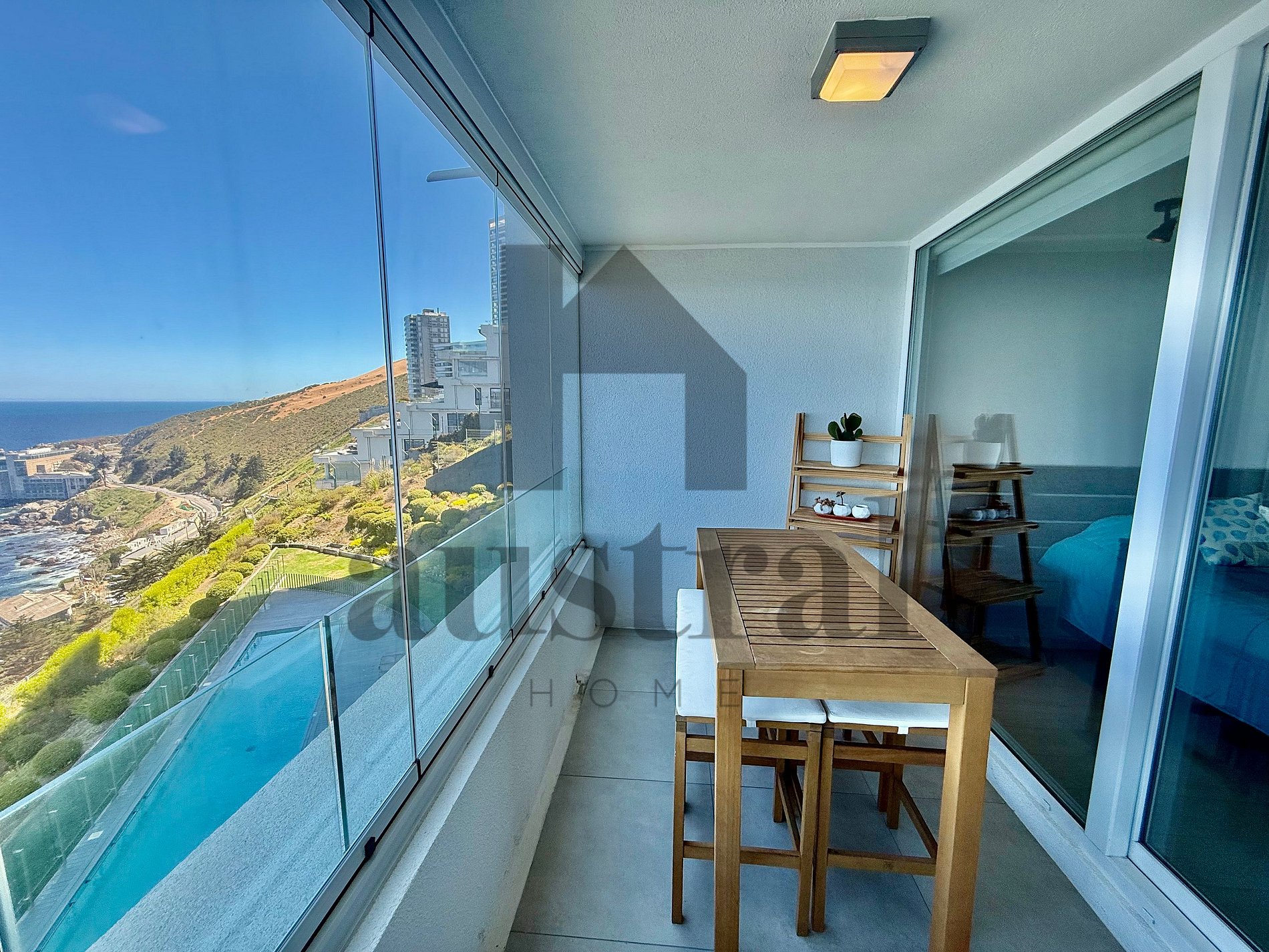 Su terraza, amplia y soleada permitirá disfrutar de una hermosa vista al mar y disfrutar de románticos atardeceres. El edificio cuenta con piscina al aire libre, piscina temperada, gimnasio y central de lavado. Se encuentra en un sector de fácil acceso y cercano a supermercados, farmacias, heladerías, tiendas, transporte público, estación de servicio Shell, playas y restaurantes. A 2 minutos de las playas de Reñaca y Playa Cochoa, a 10 minutos de Viña del Mar y 15 a 20 minutos de Valparaíso.